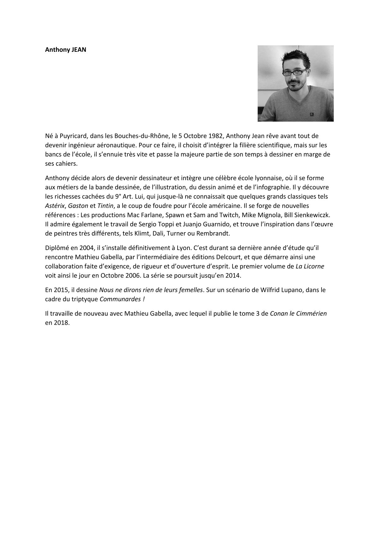 Né à Puyricard, dans les Bouches-du-Rhône, le 5 Octobre 1982, Anthony Jean rêve avant tout de devenir ingénieur aéronautique. Mais il s’ennuie très vite et passe la majeure partie de son temps à dessiner en marge de ses cahiers. Anthony décide alors de devenir dessinateur et intègre une célèbre école lyonnaise, où il se forme aux métiers de la bande dessinée, de l’illustration, du dessin animé et de l’infographie.